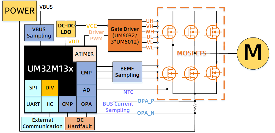 ARM Cortex-M0+,系統最高主頻32MHz PWM: 最大21路PWM 輸出(6 對死區互補) 12位1Msps ADC,OPA,ACMP 支持SIP預驅:內置6路NMOS Driver;內置6路PMOS+NMOS Driver